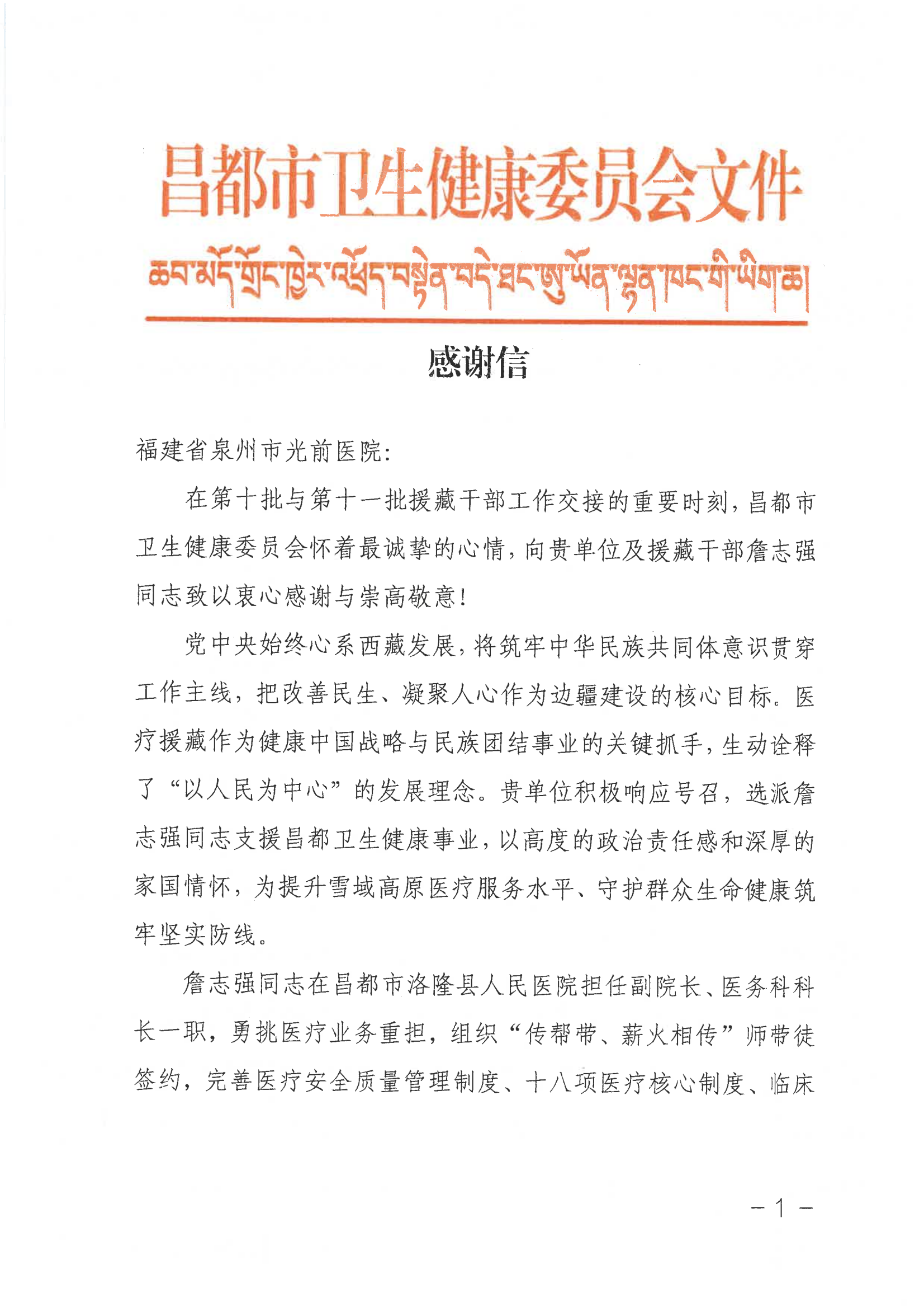 闽藏情深 医路同行——昌都市卫健委向我院发来感谢信